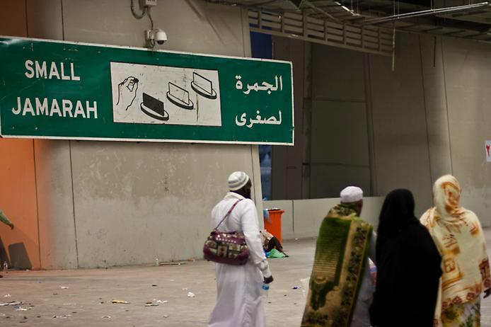 10 зуль-хиджжа. Паломники возвращаются в долину Мина, где бросают семь камней, подобранных в Муздалифе,в последний из трех столбов (джамрат аль-акаба), символизирующий Сатану, который по преданию преграждал путь Ибрахиму, направляющемуся на молитву. Совершая этот обряд, мусульмане мысленно посвящают себя Аллаху и обещают приложить максимум усилий для изгнания бесов из своей души