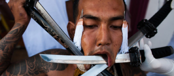 Ежегодный Вегетарианский фестиваль в Пхукете, Таиланд, представляет собой весьма опасный ритуал, который требует от участников, чтобы они протыкали свои щеки мечами, ножами, копьями, крюками и даже оружием. Считается, что во время ритуала боги вводят их тела в транс, защищают от зла и сопутствуют удаче в дальнейшем.