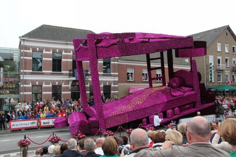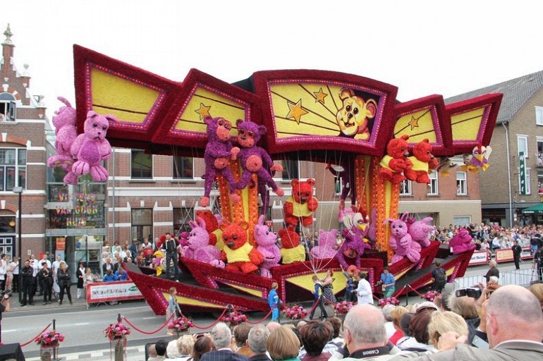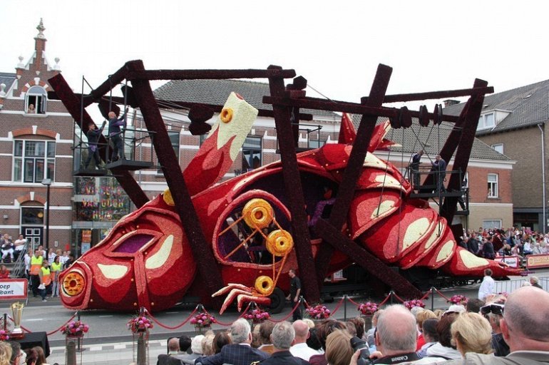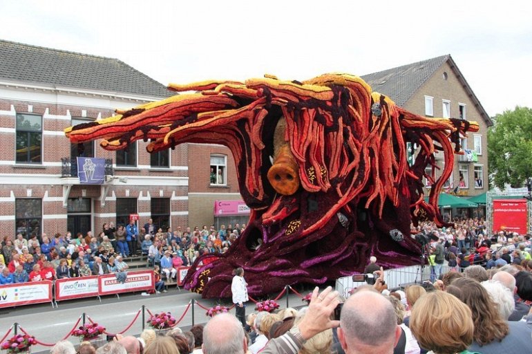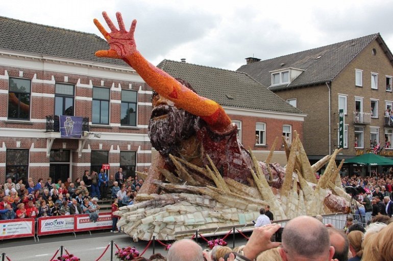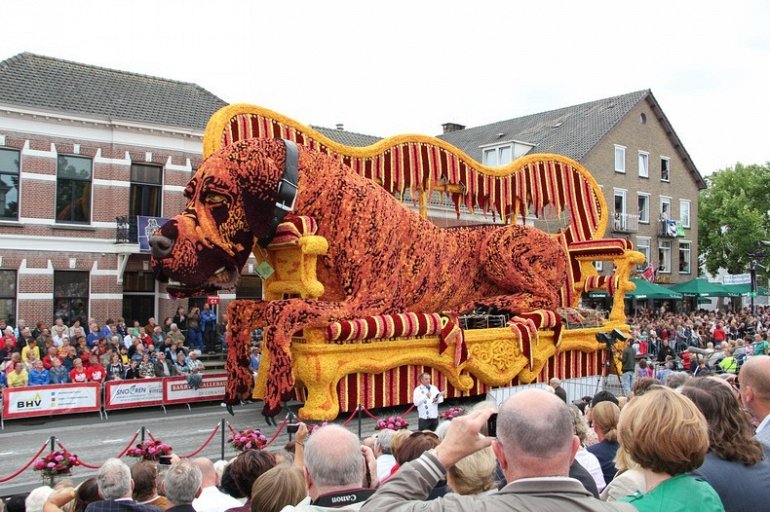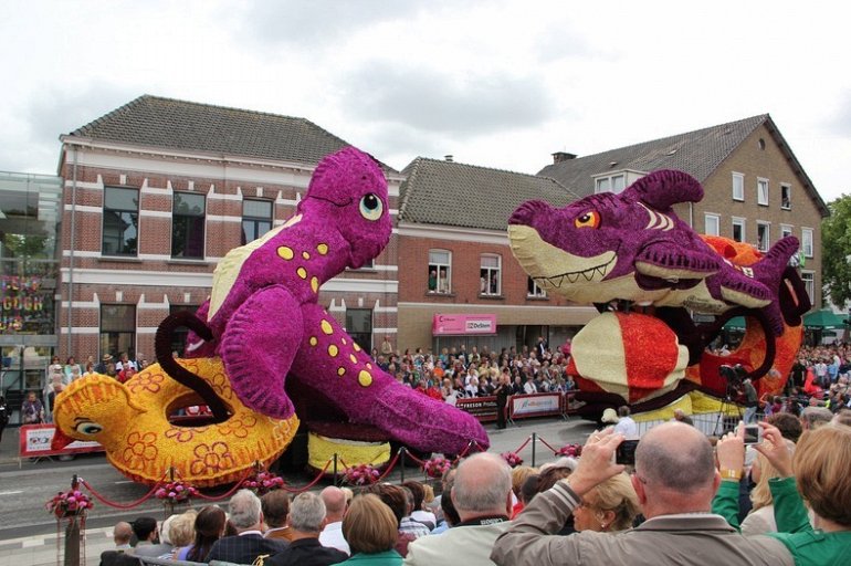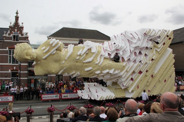 Блюменкорсо — самое большое событие года для небольшого города Зундерт, Нидерланды, и при этом крупнейший цветочный парад в мире. Люди с нетерпением ждут его в течение многих месяцев, и летом они проводят недели, готовясь к нему. Огромные платформы сделаны из проводов, картона и папье-маше и полностью покрыты георгинами в запутанных проектах. Георгины выращивают специально для парада и тысяч цветов требуются, только чтобы покрыть одну платформу. Платформы сделаны двадцатью различными деревнями, где каждый из команд состоит из сотен строителей возрастом от 1 до 100 лет, полностью посвятивших себя этому делу. Участники старшего возраста деревни часто ответственны за выращивание георгин, в то время как младшие строят подиумы в больших временных палатках, специально развернутых для этого случая. Мы уже писали об этом празднике в прошлом году, теперь расскажем Вам, как проходил Блюменкорсо 2013