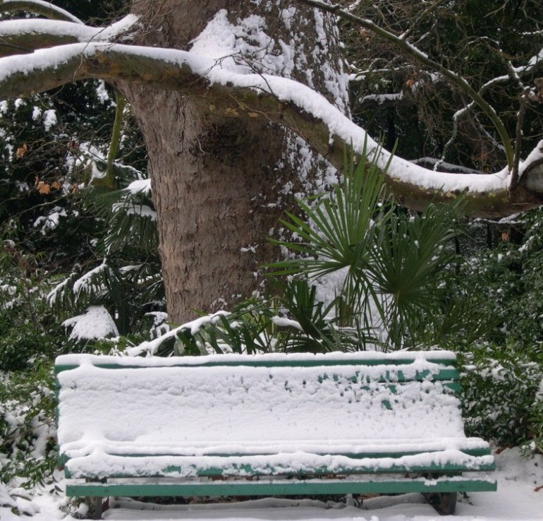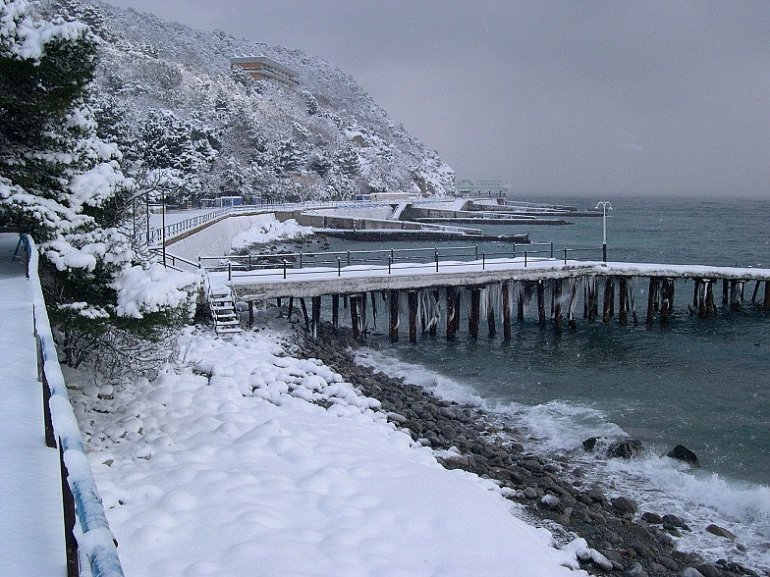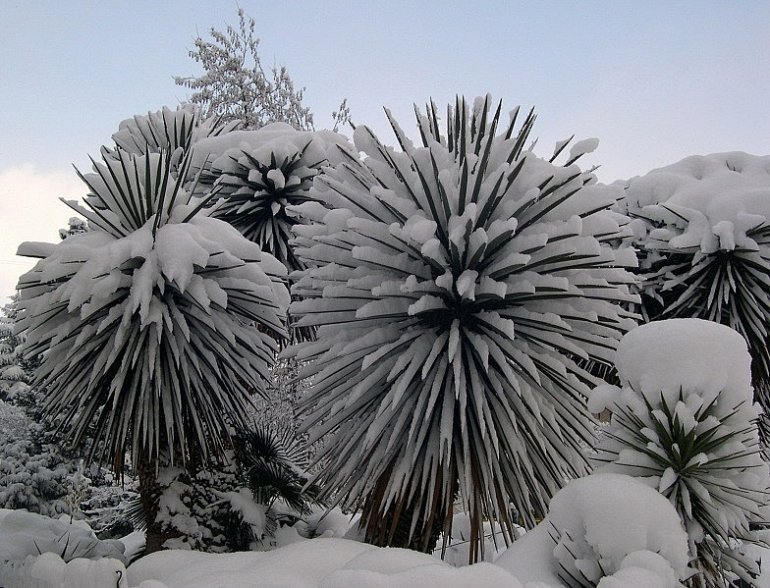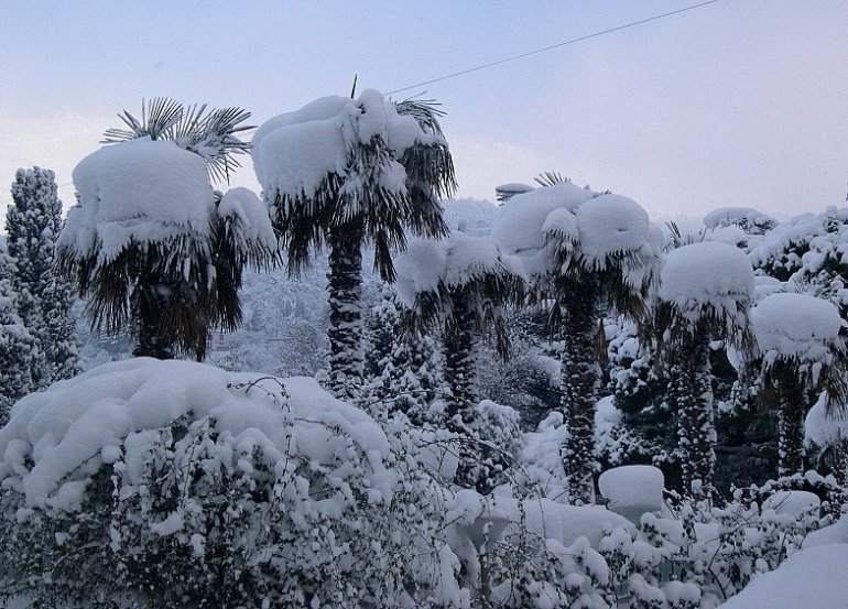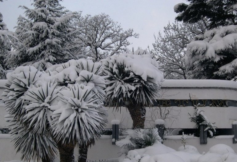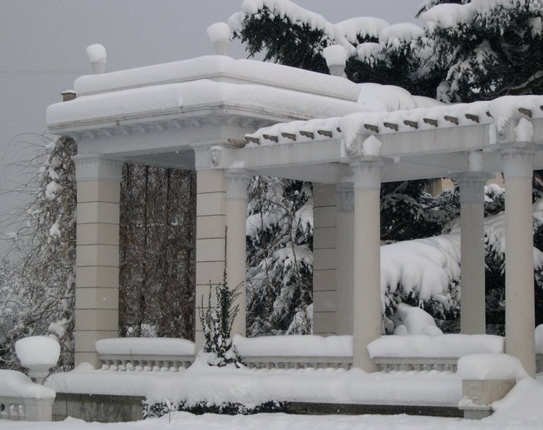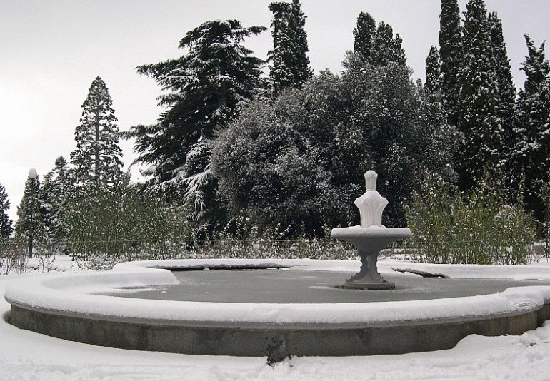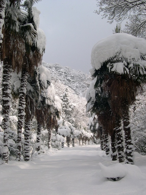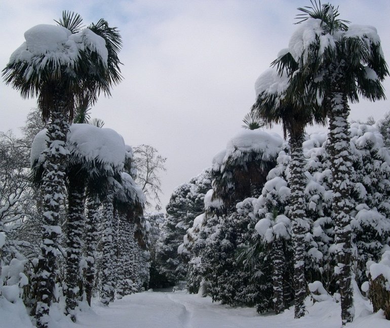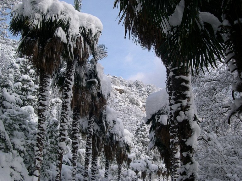 Знакомые аллеи и пейзажи Никитского ботанического сада кардинально преображаются, как только выпадает снег. Укутанные белоснежным покрывалом, они становятся похожими на декорации к какой-то зимней сказке: пальмы в снегу, выбеленные силуэты вечнозелёных гигантов, море с заснеженными пляжами и обледеневшими волнорезами… Например, так выглядят покрытые снегом парковые аллеи