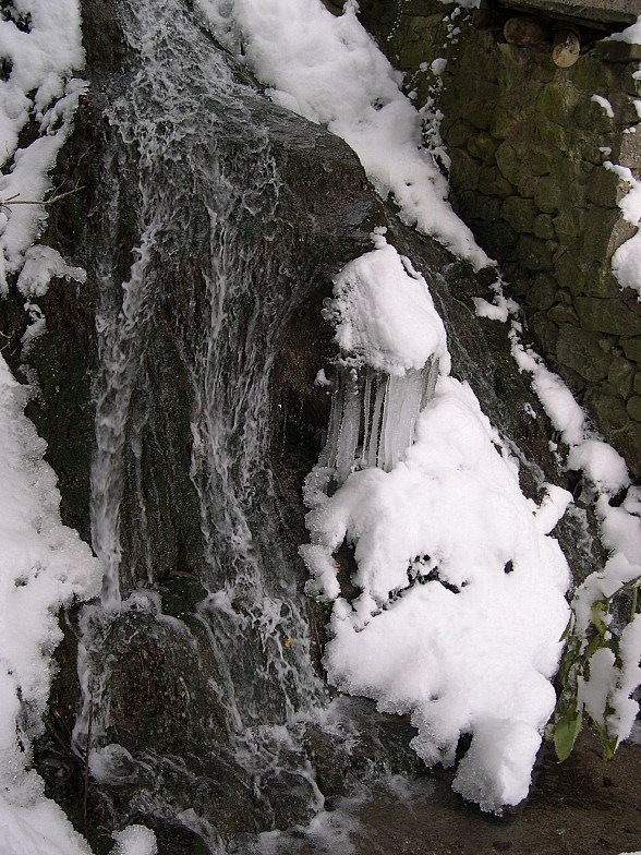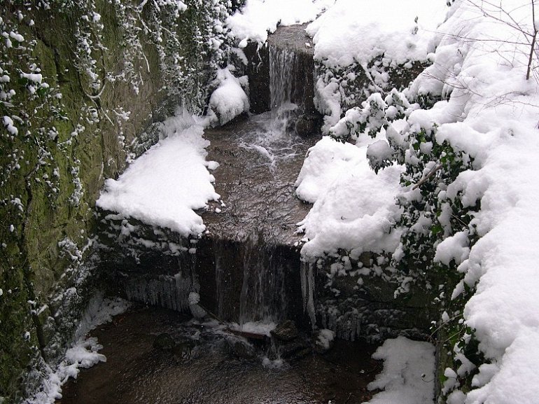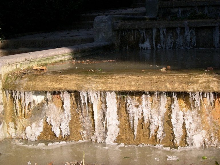 Замёрзшие бассейн и фонтан, ледяные водопады