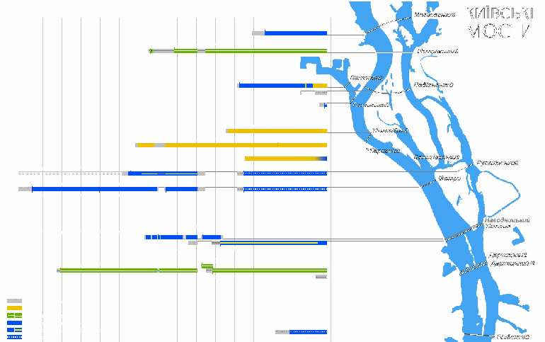 Я рассказал о семи самых больших мостах Киева, которые протянулись через Днепр. Всего же, в общей сложности, в Киеве построено 150 мостовых переходов, из которых 33 моста – через водные преграды (7 – через Днепр), 82 путепровода и 35 пешеходных мостов. Ниже представлена карта, где отмечены все мосты, а также хронология (для увеличения кликнуть по карте).