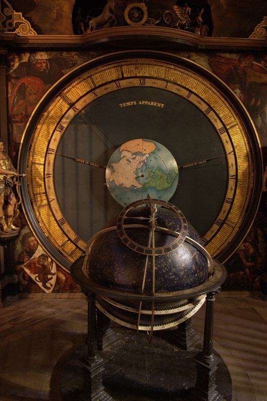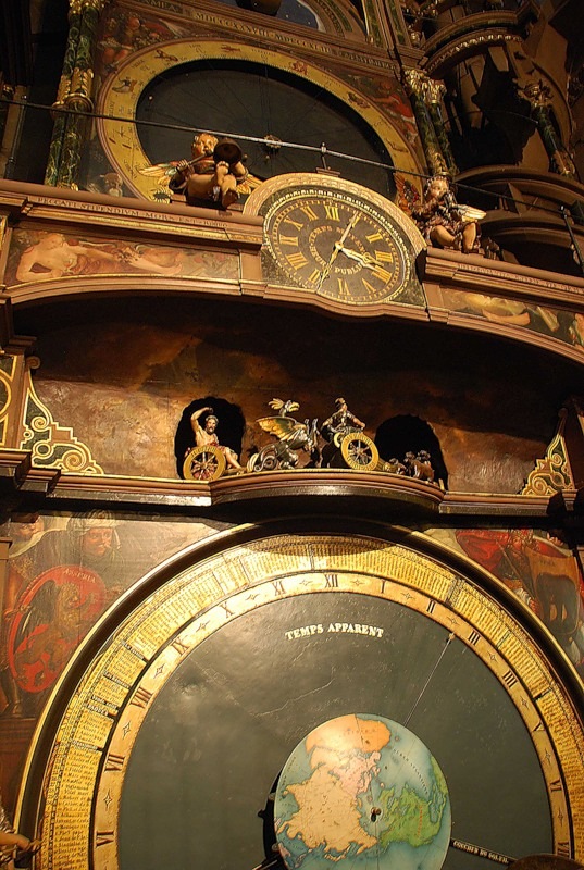 Одна из самых известных достопримечательностей собора — астрономические часы. На этом месте сменилось несколько механизмов: ранние часы XIV века, затем ренессансные, и наконец нынешняя версия, в которой сочетаются художественный корпус и сложная механика. Часы показывают астрономические данные и календарные циклы, а также известны «шествием» движущихся фигур: ежедневно в 12:30 запускается короткое представление с автоматонами.