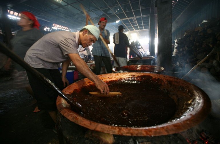 Индонезийские рабочие готовят сладкий торт под названием “додол”, один из традиционных деликатесов во время празднования Китайского Нового Года. Этнические китайские общины Индонезии готовятся к встрече наступающего года бенгальского тигра. (AP Photo/Achmad Ibrahim)![]()