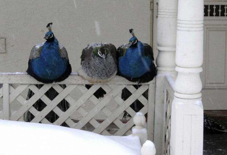 Павлины сидят на заснеженных перилах в Новом Ульме, Миннесота. Птицы, чья естественная среда обитания – тропики, наблюдают за падающим снегом (AP Photo/The Journal of New Ulm, Kevin Sweeney)