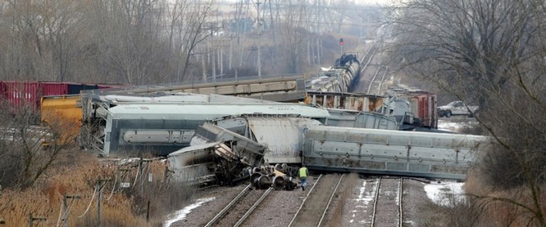 Разрушенный поезд Union Pacific, сошедший с рельс в Кеноше, Висконсин. Полиция Висконсина заявила, что никто не пострадал после того, как 24 вагона Union Pacific сошли с рельс (AP Photo/Journal Times, Gregory Shaver)