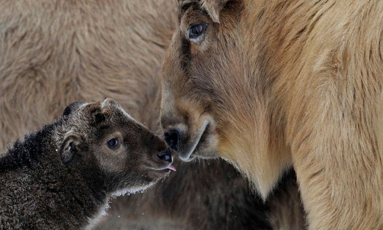 Телёнок желтого такина, один из трех новорожденных в зоопарке Либерца телят, тянется к маме. Зоопарк находится в 100 километрах от Праги, Чехия. Желтые такины – очень редкие животные. Кроме Либерца, они содержатся лишь в зоопарках Китая и Японии (AP Photo/CTK, Radek Petrasek)