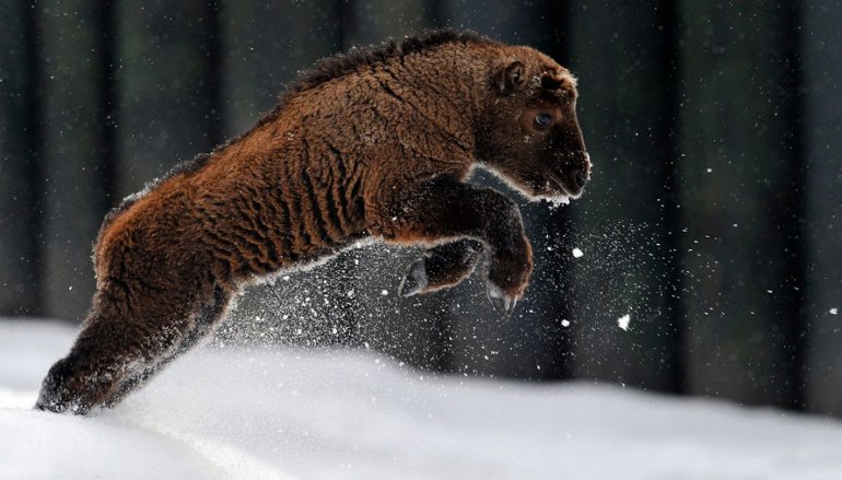 Телёнок желтого такина играет в негу в зоопарке Либерца, Чехия. Три телёнка родились в январе и уже присоединились к своему стаду (AP Photo/CTK, Radek Petrasek)