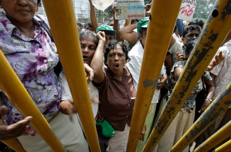 Сторонники сверженного президента Сарата Фонсеки протестуют против политики нового правительства в Коломбо, Шри Ланка (AP Photo/Eranga Jayawardena)