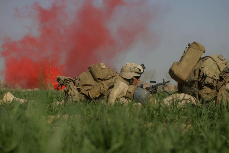 Продолжается наступательная операция в Афганистане. Военно-морские пехотинцы США в укрытии в то время как бойцы Талибана открыли по ним огонь в городе Маржа, Афганистан (AP Photo/David Guttenfelder)