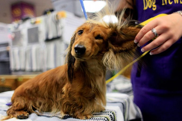 Женщина наводит лоск своей собаке перед выступлением на Kennel Club Dog Show Monday в Нью Йорке (Photo by Chris Hondros/Getty Images)