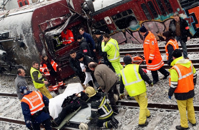 Спасатели извлекают раненного пассажира после аварии поездов в Буйзингене, Бельгия. Два пассажирских поезда столкнулись в час пик 15 февраля в пригороде Брюсселя. Погибло 20 человек (AP Photo/Yves Logghe)