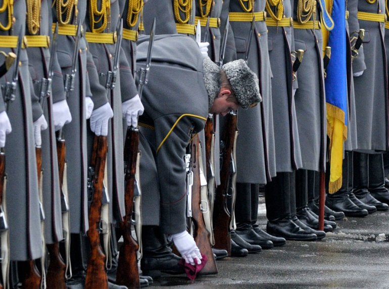 Солдат Украинского почетного караула вытирает свои ботинки во время мемориальной церемонии в честь погибших в Афганистане (1979-1989), Киев, Украина, 15 февраля 2010 (AP Photo/Sergei Chuzavkov)![]()