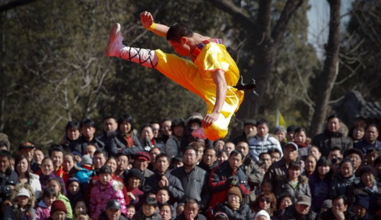 Зрители наблюдают за гонг-фу (китайское военное искусство ) во время второго дня празднований Китайского Нового Года в Пекине. Миллионы китайцев празднуют Новый Лунный Год тигра, который наступил в воскресенье (AP Photo/Vincent Thian)