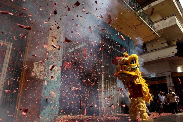 Танец Львов во время празднования Китайского Нового Года в китайском квартале Панама Сити. Китай празднует новый год начиная с 14 февраля и китайские общины по всему миру также следуют традициям (AP Photo/Arnulfo Franco)