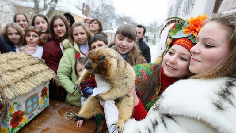Оксана, хозяйка сурка Мушко, держит его в руках вытащив из норы. День Сурка во Львове проводится ежегодно. Мушко не увидел своей тени, а это говорит о скором наступлении весны (AP Photo/Evgen Kraws)