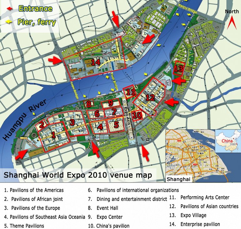 Теперь перейдем к павильонам Экспо 2010. Международные павильоны в экспо будут поделены на пять различных зон, маркированных от A до E. Среди них павильоны от участвующих стран, некоторые представляют свои достижения самостоятельно, некоторые совместно с другими странами. Есть и тематические павильоны, в этом году среди них павильон городского быта, урбанистический павильон и павильон будущего. На карте показано расположение павильонов (кликнуть для увеличения):![]()