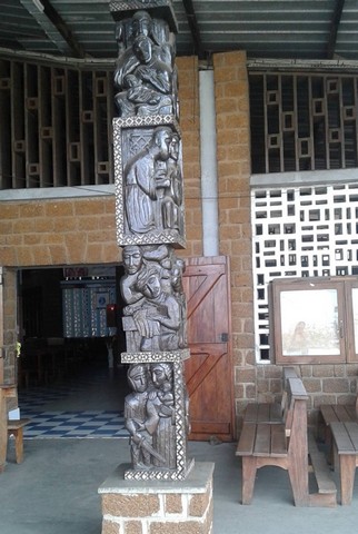 Внешний вид церкви выделяется 31 необычной деревянной колонной, каждая из которых оформлена в библейской тематике. По преданию, колонны были вырезаны слепым мастером. Интерьер церкви напоминает многие другие христианские храмы: главный алтарь включает изображение Христа на кресте, кафедру и статуи Девы Марии и Святого Михаила, созданные мастером Хуаном Ндонгом.