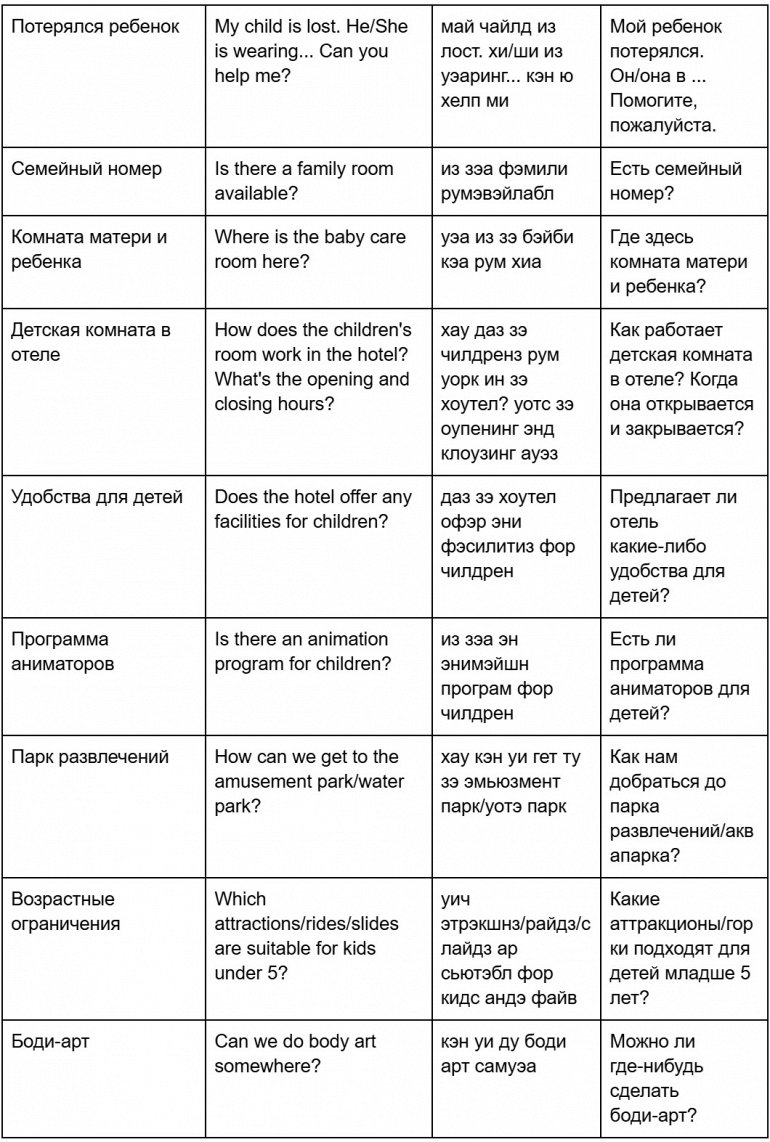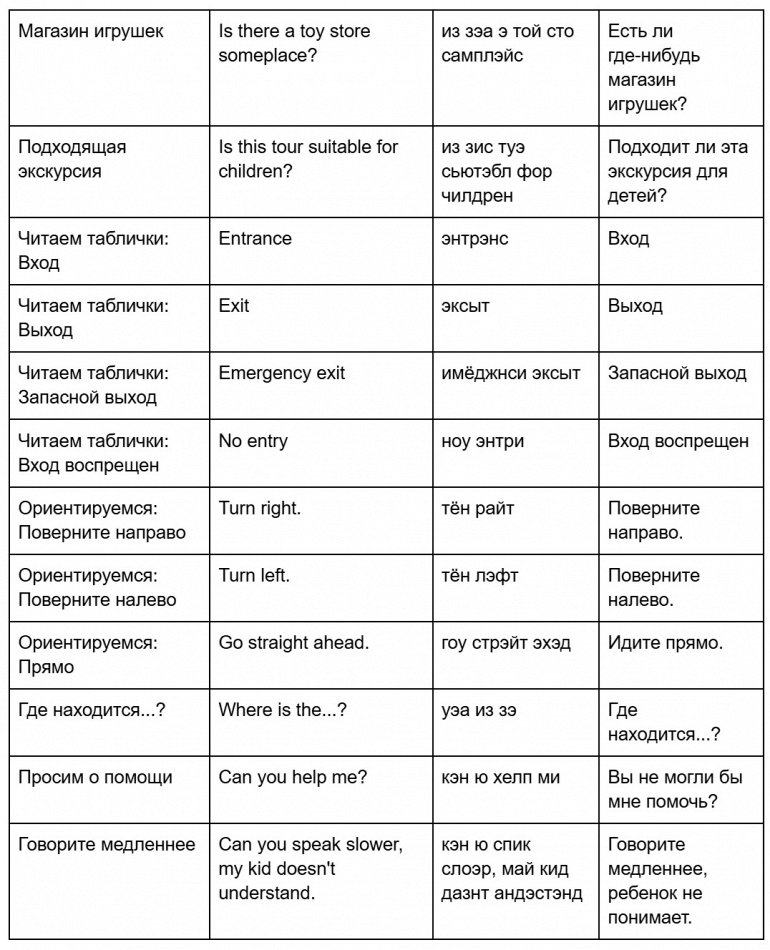 Заранее: Сфотографируйте ребенка утром (для описания одежды) и дайте ему карточку с вашим телефоном и адресом отеля на английском. На месте: Обратитесь к персоналу (музей/парк) или полиции. Фраза: "My child is lost. He/She is wearing… Can you help me?" (Мой ребенок потерялся. Он/она в … Помогите, пожалуйста.)