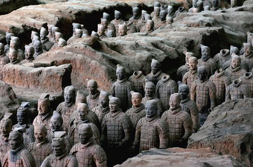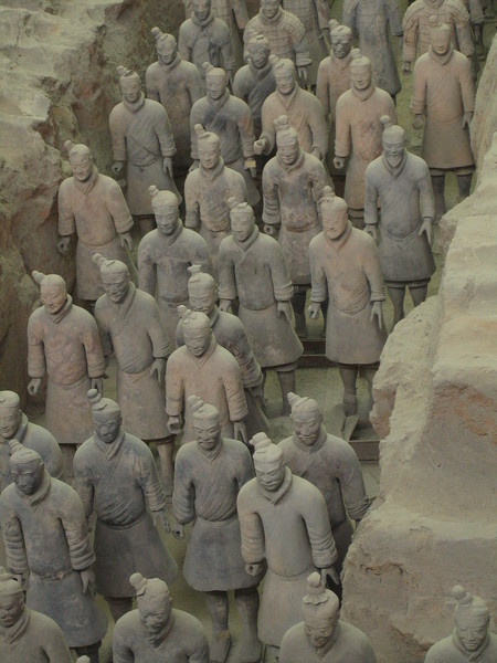 Уникальность терракотовой армии состоит в том, что при детальном рассмотрении лиц воинов вы не найдете ни одного похожего лица. Все лица и формы индивидуальны. Рост воинов 180-190 см, вес каждого около 136 кг. Каждый воин имел при себе настоящее оружие: арбалеты, пики и мечи. Но в период народных восстаний оружие было безвозвратно заимствовано крестьянами. Еще в земле были найдены фигуры чиновников, музыкантов и акробатов.