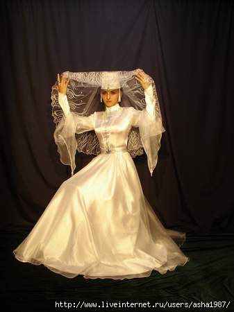 К венчанию невеста должна была предстать в одеянии, которое приготовила для нее сторона жениха. Дома, в присутствии женщин — родственниц жениха и двух подруг невесты, — под руководством посаженой матери невесту раздевали догола, затем наряжали в новые одежды. Одевала ее одна из молодых замужних родственниц, имевшая первенца-сына. Наиболее важной частью обряда была замена девичьей прически — одной или нескольких косичек — на женскую — две косы. И отныне девушка не имела права выходить на люди с непокрытой головой. Во время всей церемонии женщины пели хвалебные песни в честь невесты. Во многих культурах оголение — символ смерти. Это и лежит в основе ритуала одевания. Символически девушку надо было умертвить, а затем возродить как женщину из семьи жениха. Сейчас этот обряд практически изжил себя — невеста к приходу жениха бывает одета и ей торжественно подносят фату, перчатки и туфли.