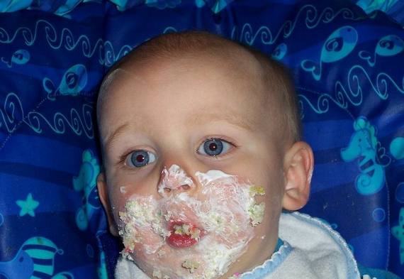 Малыш так увлеченно кушал, что испачкал всё лицо, но это доставило ему колоссальное удовольствие.