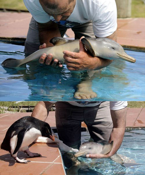 Итак, первое фото — это ребенок дельфинчик знакомится с молодым пингвином!