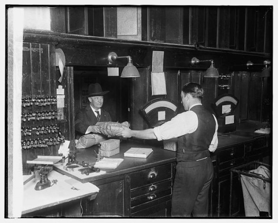 Точно так же как сегодня (если Вы не используете пересылку по почте он-лайн или Автоматизированный Почтовый Центр), дорога почтового пакета начинается в окне почтового отделения. Технология, используемая кассиром, изменилась, но с 1925 года, она все еще подразумевает весы, печати и деньги