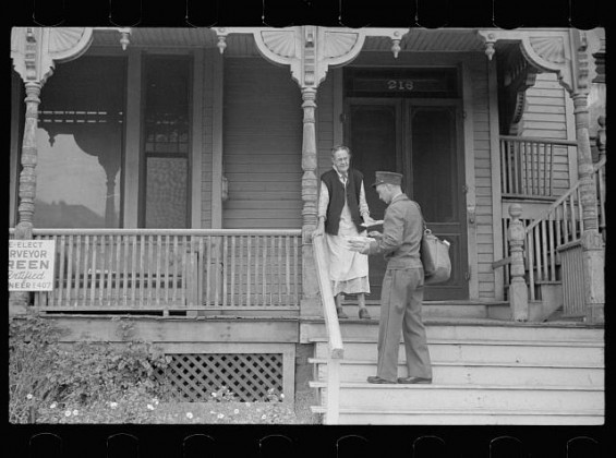 Прежде чем были введены обязательные почтовые ящики, почтальоны были вынуждены стучаться в каждую дверь, завязывая дружеские отношения с хозяевами дома. Вот почтальон, приветствующий одного из его клиентов в Небраске, 1938: