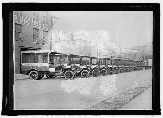В наше время большинство используемых транспортных средств – это грузовики, перевозящие грузы между почтовыми отделениями. В первой половине прошлого столетия транспорт был более разнообразным. Автомобили для поставок почты начали использоваться в начале 1900-ых. На этой фотографии серия грузовиков, для почтовых перевозок: