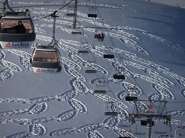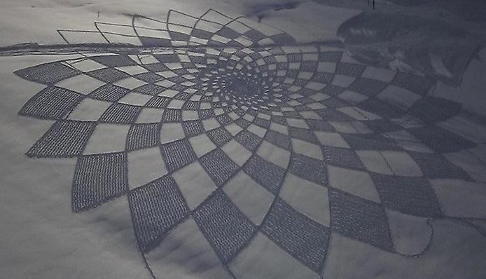 Художник Саймон Бек создает удивительные картины на снегу используя специально изготовленные для этого снегоступы. Каждая из его работ, как правило, занимает площадь примерно трех футбольных полей. На создание одной такой картины уходит около двух дней. Саймон работает примерно по 9 часов в сутки, пока не становится слишком усталым для того, чтоб продолжать. Если начинает темнеть, он использует осветительные прожекторы