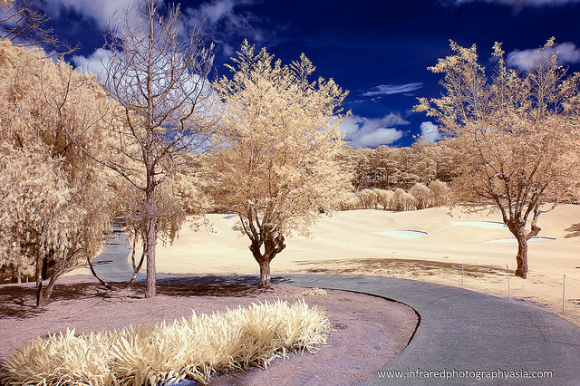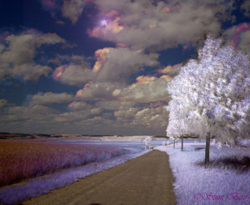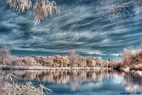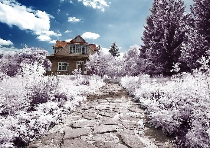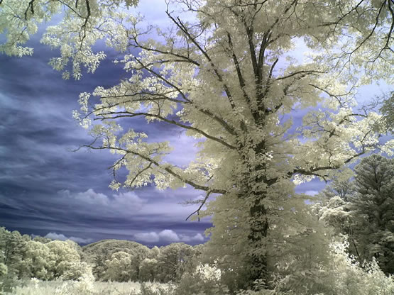 Зелень травы и деревьев на таких снимках становится почти абсолютно белой, а ясное голубое небо всегда будет очень темным, почти черным…Облака остаются обычного цвета, но за счет их сочетания с практически черным небом выглядят очень контрастно…