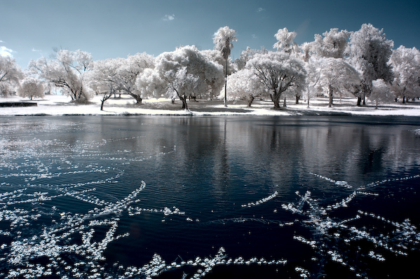 Вода плохо отражает инфракрасные лучи, поэтому на таких снимках выглядит темнее обычного, а вот снег становится ослепительно белым…