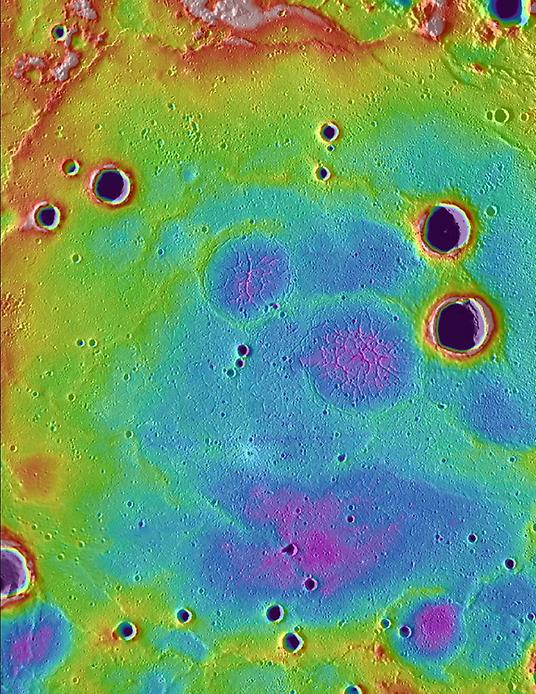 Космический шаттл Мессенджер сделал ряд новых снимков северных широт планеты Меркурий, с видом в перспективе на огромные вулканические равнины и с цветной топографической картой поверхности. Фиолетовые цвета окрашивают самые низкие места, а белый цвет является самым высоким