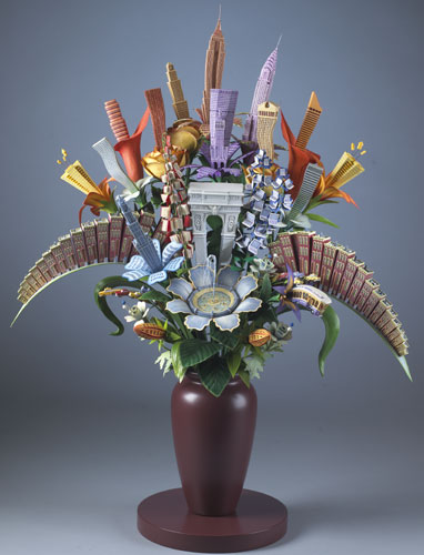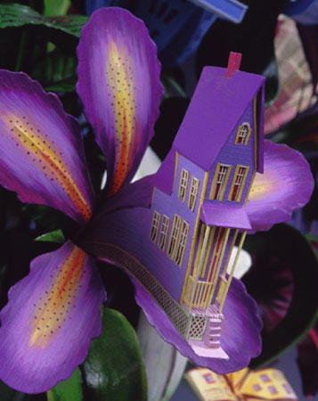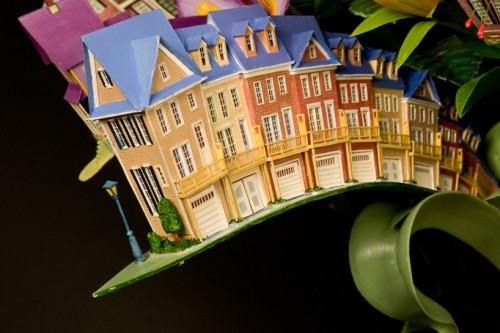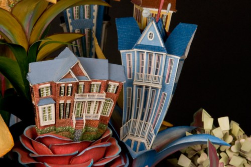 На первый взгяд, эти скульптуры выглядят очень нежным, хрупкими и красивыми, но в реальности же это замысловатые конструкции из сооружений викторианского стиля. Маленькие домики, здания, башни, как бы возвышаются из центра цветка, либо размещаются на зелёных листьях
