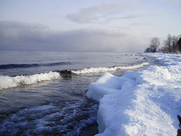 До конца января водная гладь Байкала в этом районе не замерзает. Волны чистейшей воды накатывают на обледеневший берег.