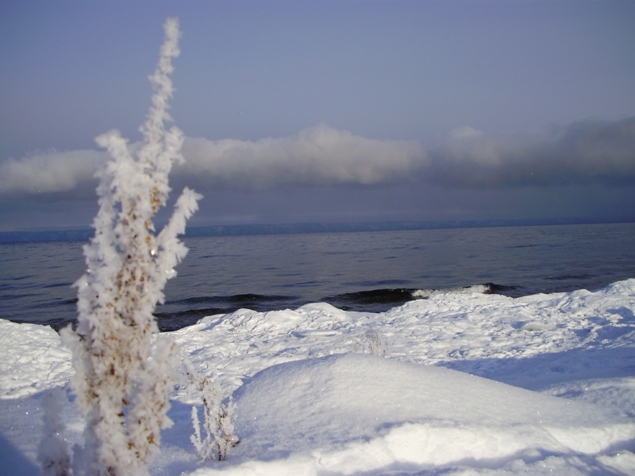 К началу февраля ветры с севера нагоняют ледяную шубу, которая быстро усмиряет и сковывает озеро. Тогда с горы Соболиной почти до мая месяца можно любоваться огромным, простирающимся до самого горизонта, голубым зеркалом.