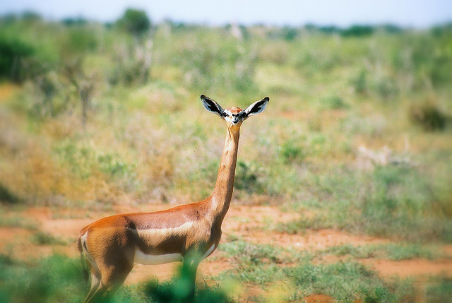 Это животное обитает в Восточной Африке, в пределах Сомали и Кении. Своей длинной шеей антилопа напоминает жирафа и при этом характерной особенностью животного являются чрезмерно большие уши, которые весьма гармонично выглядят