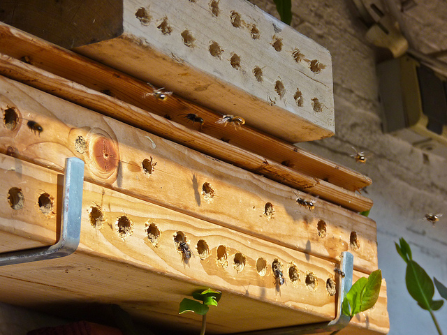 Отверстия, которые высверливаются в дереве, должны быть под наклоном, чтоб дождь не смог затопить домик. Расстояние между дырочками должно быть достаточным, чтоб пчелы не жили в тесноте.