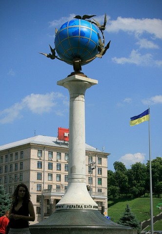 Нулевой километр в Киеве. На нем написаны расстояния до всех крупных городов мира.