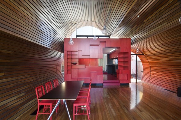 Ярко-красное сердце дома вмещает в себя кухню и находится в самом центре дома, контрастируя с абсолютно белыми стенами в первой части дома