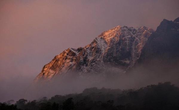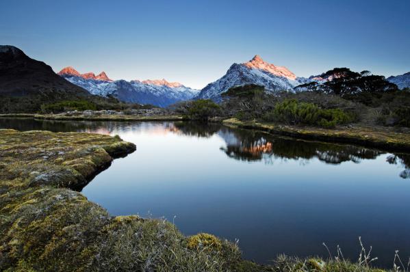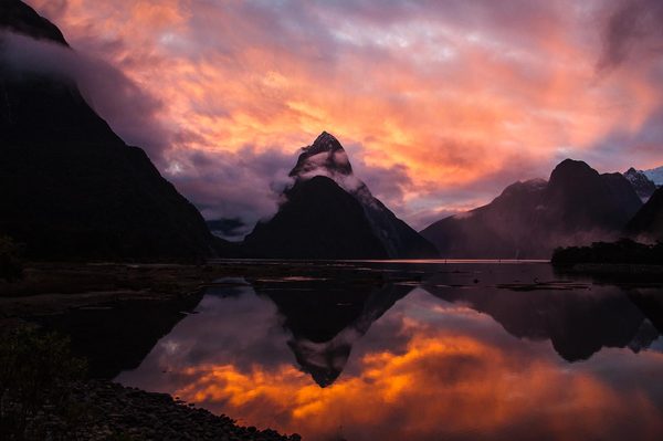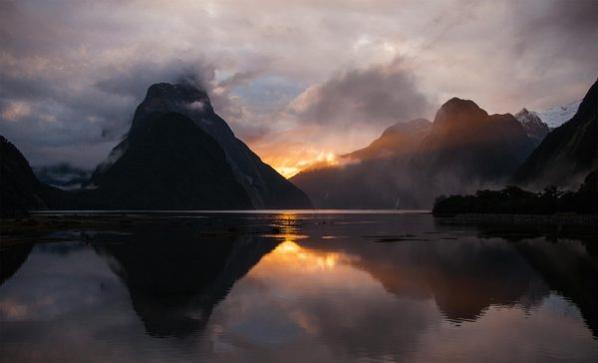 Милфорд – фьорд, недалеко от Тасманового моря. Прежде, чем морские воды затопили его, это была ледниковая долина, а ее бурные утесы были сформированы льдом. Горы здесь взлетают не внушительные 5,500 футов (1,675 метров), в то время как сам бассейн с фьордом падает до 1,280 футов — на 390 метров ниже уровня моря. Гора Кристина и Горы Дарран на рассвете: