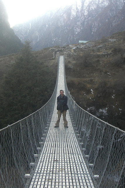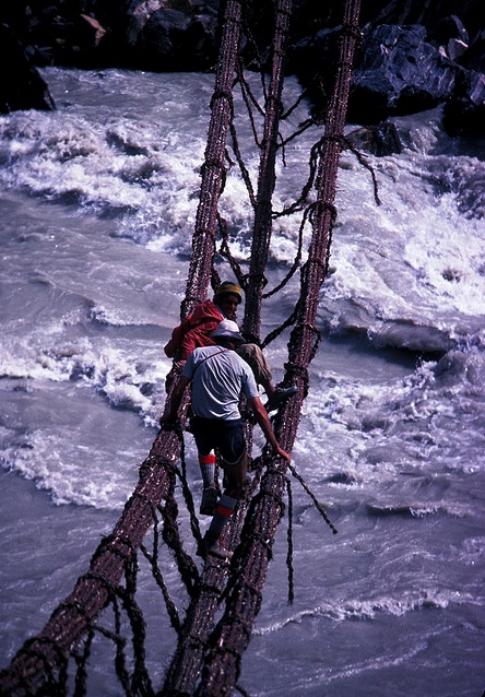 Этот мост в Гималаях выглядит довольно надежно, но один сильный порыв ветра, и вы летите в бездну.
