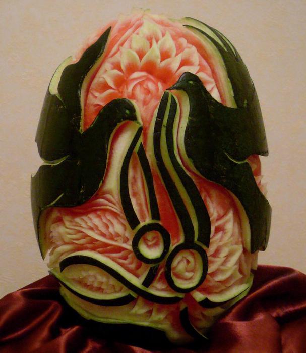 Красиво украшенное блюдо — очень важный элемент современного повседневного и праздничного стола. Украшения заставляют по другому взглянуть даже на привычные блюда, вызывая радость у детей и взрослых. И фигурная резьба по овощам и фруктам может в этом деле очень хорошо помочь. Карвинг — это довольно молодая "забава", которая порождает настоящие шедевры искусста — съедобные и поэтому крайне недолговечные. Живет это искусство после съедения только на фото и на видео, но от этого не является менее красивым и значимым. Предлагаю ими полюбоваться: