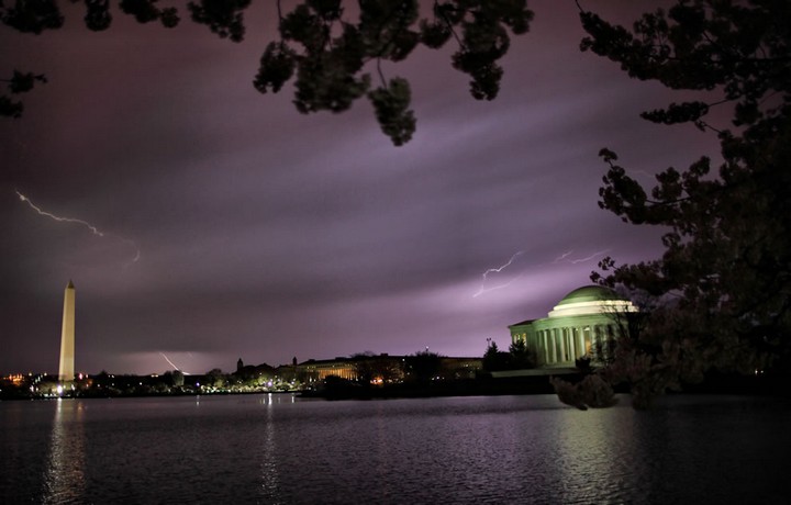 “Молния вспыхивает недалеко от памятника и мемориала Джефферсона. Также вы можете видеть деревья вишни в полном цвету”.