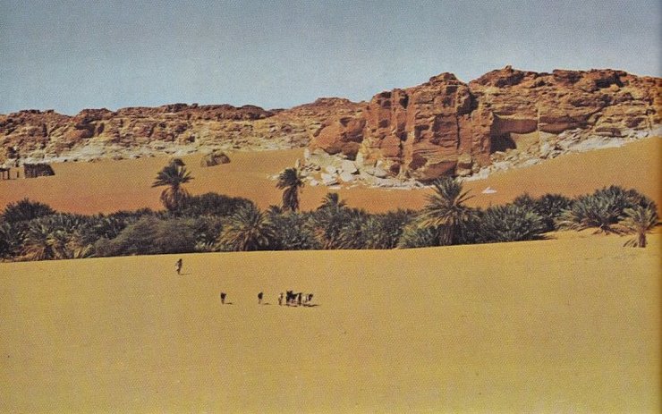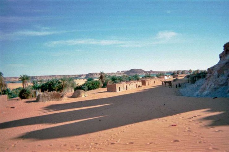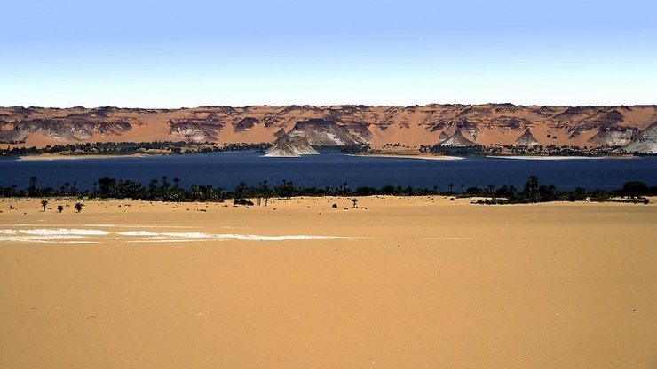 Унианга — цепь из 18 озер, расположенных в самом сердце пустыни Сахара в чрезвычайно засушливой области Северного Чада, где средний ежегодный уровень осадков едва превышает 2 миллиметра. Озера зависят от подземных потоков воды, которые образовались здесь очень давно, когда сахарский климат был намного более влажным.Около 10 тысяч лет назад эта область была единственным огромным озером длиной в десятки километров. Так как климат в последние годы кардинально изменился, озеро уменьшилось, а расширяющиеся дюны разделили его на несколько мелких водоемов. 18 озер — это все, что дошло до наших дней. Этот снимок сделан NASA 14 ноября 2009 года: