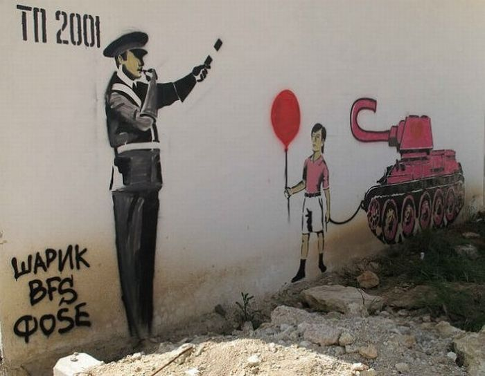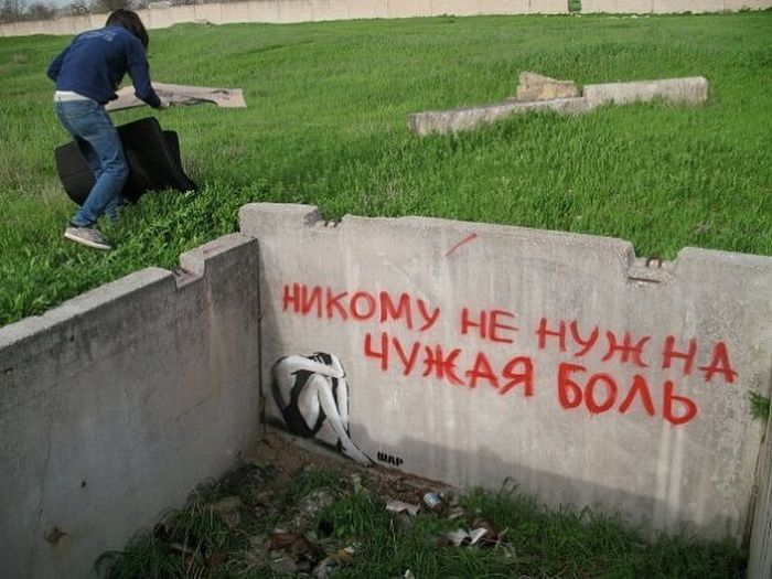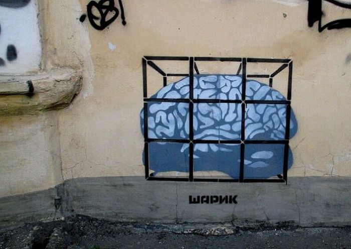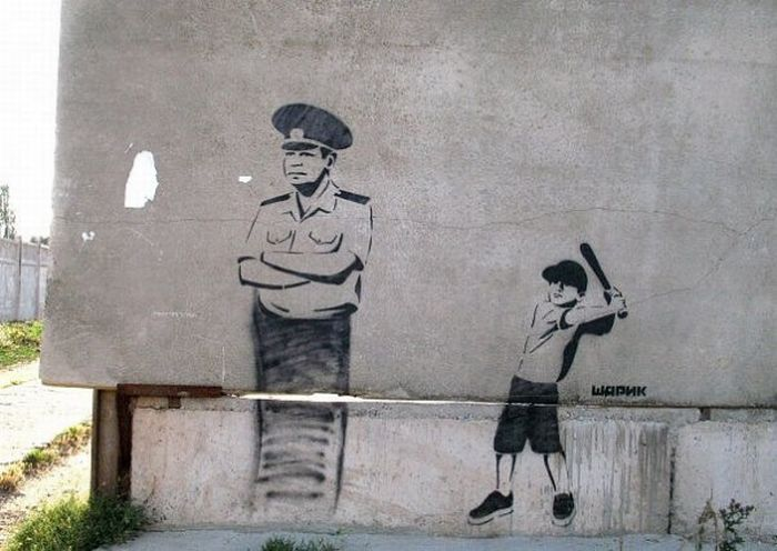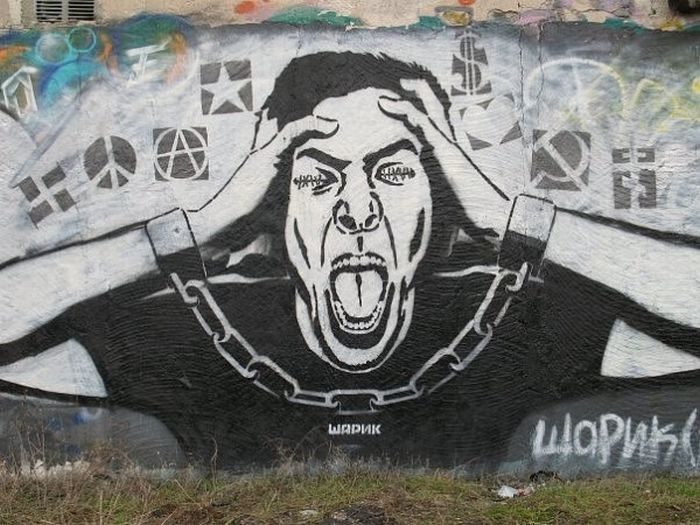 Город Симферополь является столицей Крыма — курортного полуострова с выходом на Черное и Азовское моря. Здесь создает свои работы граффитист под псевдонимом Шарик. Его стиль очень походит на граффити знаменитого Бэнкси из Великобритании, а некоторые работы даже превосходят картины британца по глубине смысла и качеству исполнения.