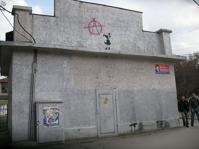 Бэнкси — псевдоним продуктивного британского граффитиста, политического активиста и живописца, личность которого не подтверждена. Мы уже неоднократно уделяли внимание его работам на страницах LifeGlobe, теперь пришел черед и Шарика из Симферополя. По словам британского торговца произведениями искусства, который отдохнул в Крыму, украинские граффити на стенах “очень, очень Banksy.”