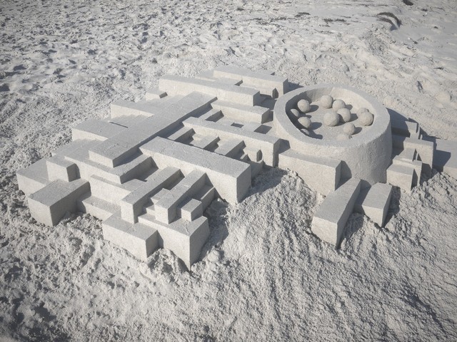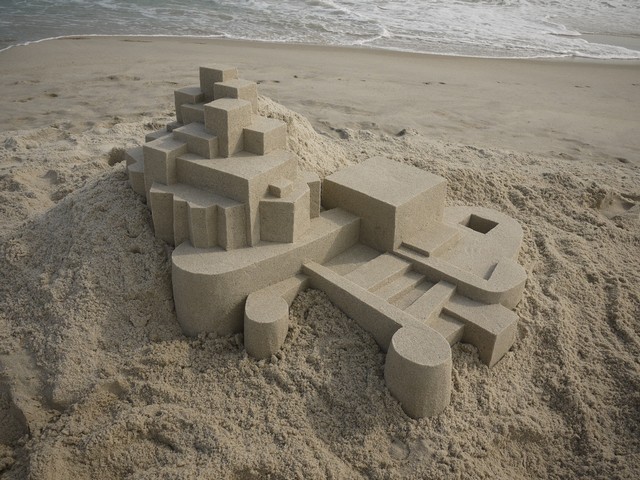 Используя множество трехмерных геометрических форм, таких как призмы, пирамиды, цилиндры, сферы и конусы, художник Кэлвин Сейберт создает замечательные скульптуры из песка, которые являются не просто 'замками', а чем-то намного большим, чем просто беспорядочно помещенные стандартные блоки.