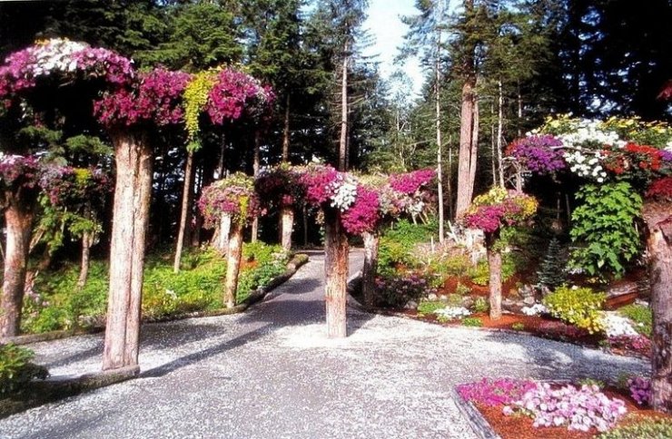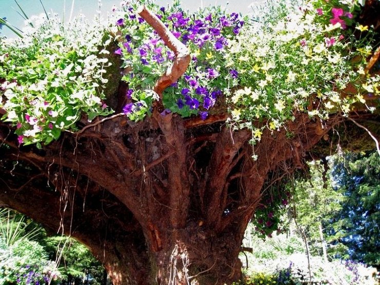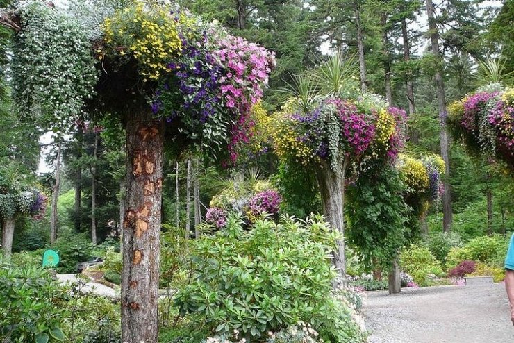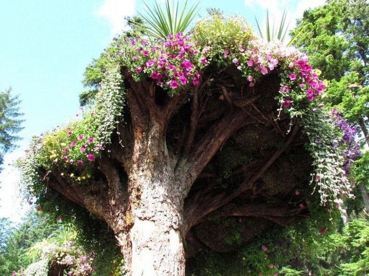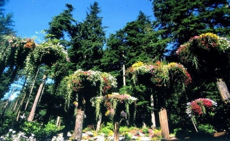 Мы уже писали о самых знаменитых вертикальных садах в мире, а теперь расскажем о еще более необычном изобретении. Перевернутые деревья, известные как “Цветочные Башни”, являются местной ситхинской елью и западной тсугой, срубленными оползнем в 1984, который выкорчевал большую часть растительности горы. Стив собрал срубленные деревья, перевернул их, пересадил, и превратил их в естественные цветочные горшки. Вершины захоронены на несколько футов в земле, в то время как корни стали гнездом для ярких цветных бегоний, фуксий и петуний.